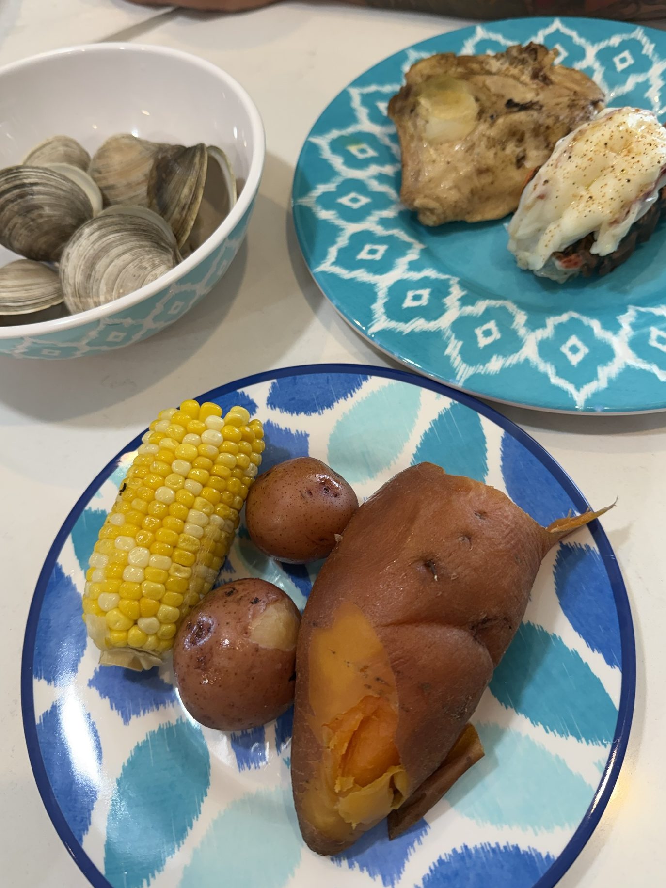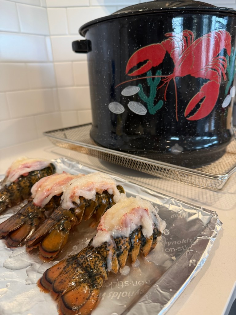 • Lobster Tails (my adult shortcut): I usually skip the whole lobster these days and go with tails. Once the clambake is almost finished, I cook the lobster tails separately — about 10 minutes under the broiler, just until the meat turns white and the edges caramelize.