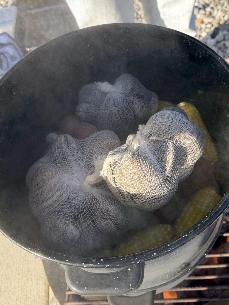 Once the steam pot is over the hot coals poor broth over the chicken, and potatoes. Put on lid and always make sure you have liquid on bottom to prevent burning. You will start to see it steam. Keep lid on 30 minutes, unless you smell burning and need to add more broth or water. Then put corn and clams and more broth over top cook for about 45-1 hr more. Total cook time 1 – 1 1/2hrs.