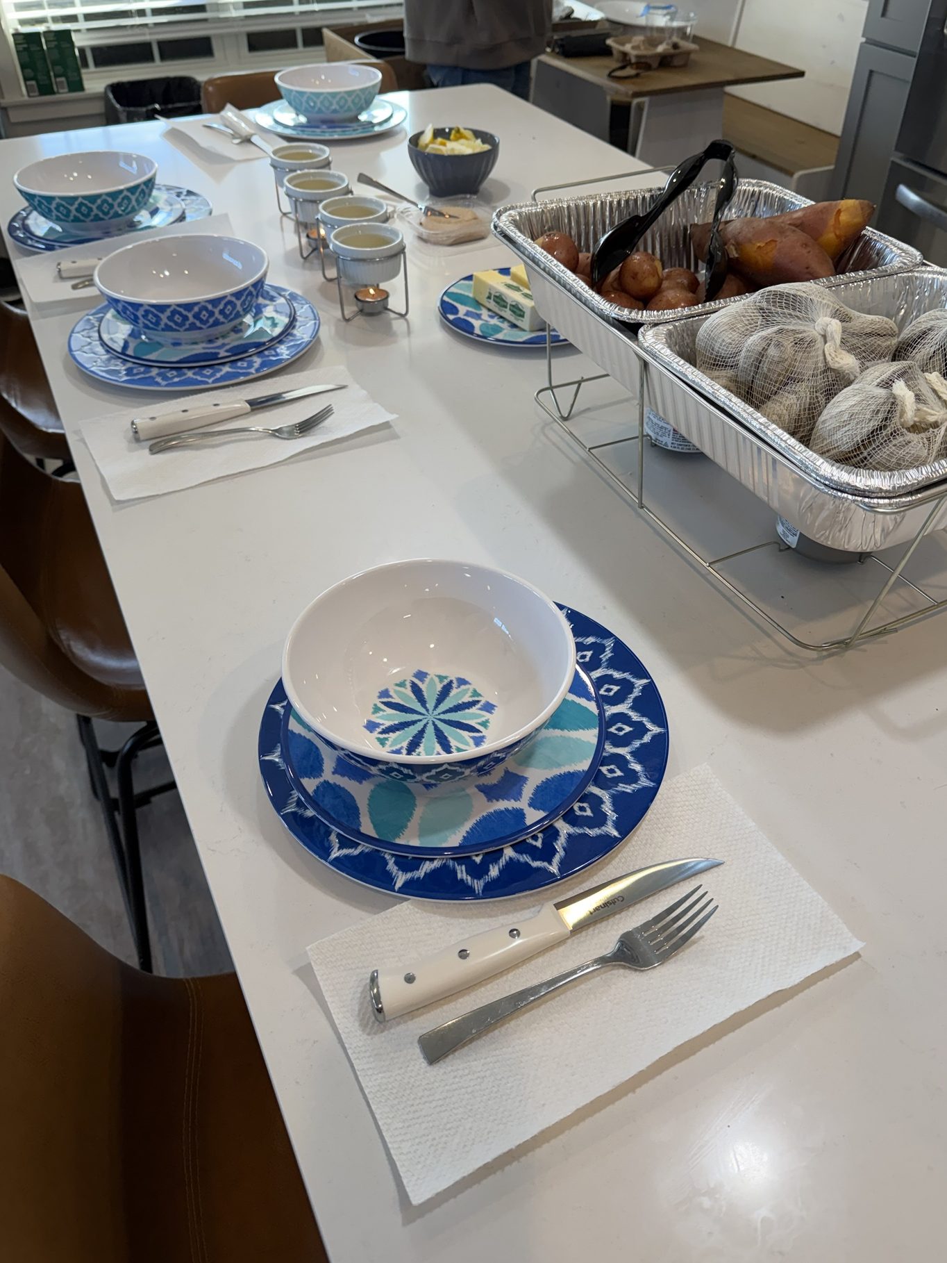 I use catering trays with small heat burners underneath to keep everything warm while I plate the food. It helps when serving a crowd and makes it feel a little more like a true fall feast.